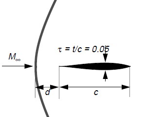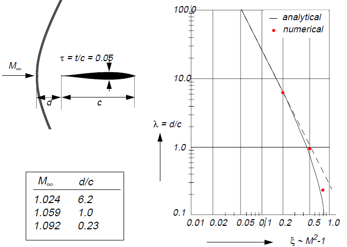 Detached bow wave: Asymptotic behavior with Mach -> 1 |